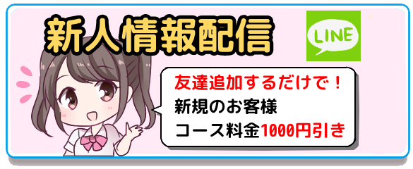 こちらの新人情報(クリックで友達追加)を受付で追加していただいたお客様!どのコースを選んでも、コース料金から1000円引かせていただきます!